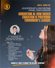 Thompson will lead a dynamic discussion with an exceptional panel of thought leaders, including Greg Riley, Dean of the UConn School of Business; Tamilla Triantoro, Ph.D., Associate Professor at Quinnipiac University and a global AI Consultant; and Kyle Clements, Senior Director of Engineer at FactSet, offering real-world insight into workforce readiness and innovation. Together, they will bridge perspectives from higher education, industry, and emerging technology.